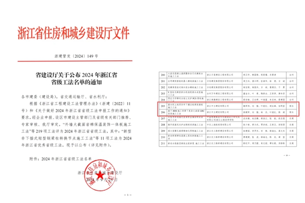 在2024年浙江省省級工法評選中,“富水軟土地質(zhì)條件下灌注樁高效接樁施工工法”與“基于BIM技術(shù)復雜大曲面GRC安裝施工工法”2項工法榮獲浙江省省級工法。